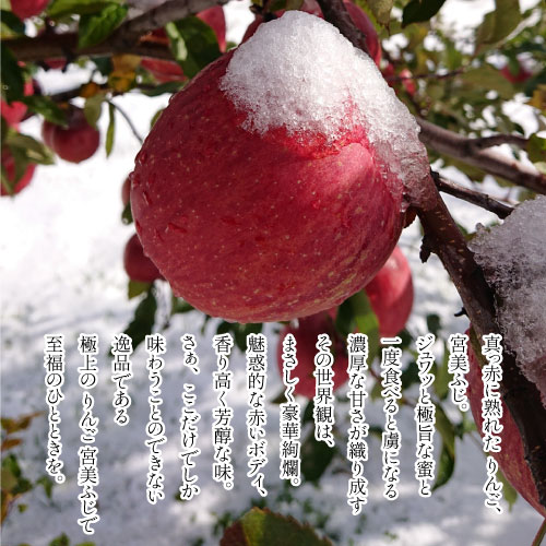 真っ赤に熟れた林檎、宮美ふじ。ジュワッと極旨な蜜と一度食べると虜になる濃厚な甘さが織り成すその世界観は、まさしく豪華絢爛。 魅惑的な赤いボディ、香り高く芳醇な味。さぁ、ここだけでしか味わうことのできない逸品である極上の林檎”宮美ふじ”で至福のひとときを。